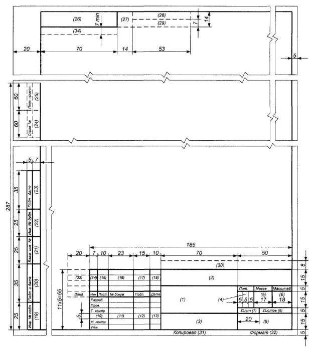 4.2 Для целей управления документами в процессах документооборота допускается вводить дополнительные реквизиты, не отображаемые на документах в бумажной форме. Номенклатура таких реквизитов и правила выполнения устанавливаются нормативными документами организации. Для документации на изделия, разрабатываемые по заказу Министерства обороны, номенклатуру дополнительных реквизитов документов согласуют с заказчиком (представительством заказчика). (Поправка, ИУС 4-2007). 5 Порядок выполнения основной надписи и дополнительных граф5.1 Содержание, расположение и размеры граф основной надписи, дополнительных граф к ней, а также размеры рамок на чертежах и схемах должны соответствовать форме 1, а в текстовых документах - формам 2, 2а и 2б. Допускается для последующих листов чертежей и схем применять форму 2а. 5.2 Основная надпись, дополнительные графы к ней и рамки выполняют сплошными основными и сплошными тонкими линиями по ГОСТ 2.303. 5.3 Основную надпись располагают в правом нижнем углу конструкторских документов. На листах формата А4 по ГОСТ 2.301 основную надпись располагают вдоль короткой стороны листа. Таблица изменений в основной надписи при необходимости может продолжаться вверх или влево от основной надписи (при наличии графы 33 - влево от нее). При расположении таблицы изменений слева от основной надписи наименования граф 14-18 повторяют. Расположение дополнительных граф показано в приложении А. 5.4 Для быстрого нахождения на чертеже (схеме) составной части изделия или его элемента рекомендуется разбивать поле чертежа (схемы) на зоны. Отметки, разделяющие чертеж (схему) на зоны, рекомендуется наносить на расстоянии, равном одной из сторон формата А4 (рисунки Б.1 и Б.2 приложения Б). Отметки наносят: по горизонтали - арабскими цифрами справа налево; по вертикали - прописными буквами латинского алфавита снизу вверх. Зоны обозначают сочетанием цифр и букв, например: 1А, 2А, 3А, 1В, 2В, 3В и т.д. 5.5 На чертежах (схемах) с одним обозначением, выполненных на нескольких листах, нумерация зон по горизонтали должна быть сквозной в пределах всех листов. 6 Порядок заполнения основной надписи и дополнительных граф6.1 В графах основной надписи и дополнительных графах (номера граф на формах показаны в круглых скобках) указывают значения соответствующих реквизитов или атрибутов согласно таблице 1: в графе 1 - наименование изделия и наименование документа, если этому документу присвоен код. Для изделий народнохозяйственного назначения допускается не указывать наименование документа, если его код определен ГОСТ 2.102, ГОСТ 2.601, ГОСТ 2.602, ГОСТ 2.701. Наименование изделия должно соответствовать принятой терминологии и быть по возможности кратким. Наименование изделия записывают в именительном падеже единственного числа. В наименовании, состоящем из нескольких слов, на первом месте помещают имя существительное, например: «Колесо зубчатое». В наименование изделия не включают, как правило, сведения о назначении изделия и его местоположении; (Поправка, ИУС 12-2006). (Поправка, ИУС 4-2007). в графе 2 - обозначение документа по ГОСТ 2.201 и код, если его код определен ГОСТ 2.102, ГОСТ 2.601, ГОСТ 2.602, ГОСТ 2.701. Допускается применять ранее принятую систему обозначений документов; в графе 3 - обозначение материала детали (графу заполняют только на чертежах деталей); в графе 4 - литеру, присвоенную