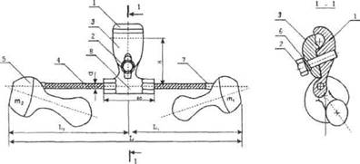 распространенных приспособлений для гашения вибрации, выпускаемых серийно с 2.2 За рубежом в усовершенствованном варианте в настоящее время гаситель вибрации Стокбриджа встречается в виде конструкции типа «Дог Боун». В СССР применялись гасители Стокбриджа ГВН и ГПГ. 2.3 Типовые гасители вибрации Стокбриджа ГВН и ГПГ имеют две основные частоты колебаний. Компоновка этих гасителей одинакова, их динамические характеристики рассматриваются как однотипные. Эффективность таких гасителей зависит от остроты пиков резонансных частот и близости расположения одного к другому. Полная защита проводов от вибрации обеспечивается при большом количестве типоразмеров. Для эффективности гашения вибрации на применяемых в настоящее время проводах и тросах требуются 72 типоразмера гасителей вибрации (см. Каталог «Арматура и изоляторы для воздушных линий электропередачи», - М., 2001). 2.4 В мировой практике для создания высоких эксплуатационных показателей гасителей вибрации в основном используются два подхода: - применение эксцентрично закрепленного груза специальной формы («собачья кость», «пешка», подковообразный и т.д.), работающего при вибрации на закручивание; - использование тросика, который выполняется с предварительным обжатием повивов. За счет применения эксцентрично закрепленного груза гаситель получает третью рабочую частоту, которая располагается между первой и второй частотами, свойственными двухчастотным гасителям, а за счет обжатия - расширение резонансных частот пиков. Указанный способ позволил благодаря конструктивному решению ликвидировать «провалы» в кривой зависимости поглощения энергии от частоты и этим поднять эффективность гасителя. 2.5 С 1 - захват зажима; 2 - крепежный болт; 3 - плашка; 4 - упругий элемент; 5 - груз; 6 - пружинные шайбы; 7 - втулка гасителя; 8 - зажим гасителя Рисунок 1 - Многочастотный гаситель вибрации ГВП Гасители вибрации ГВП с количеством основных частот три и более получили название многочастотных. Гасители ГВП имеют одинаковую массу грузов и длину плеч гибкого элемента (L1 = L2; m1 = m2). Марки и технические параметры гасителей ГВП приведены в таблице 1. За счет улучшенных динамических показателей количество типоразмеров таких гасителей доведено до 18. Таблица 1 - Марки и технические параметры гасителей вибрации ГВП
