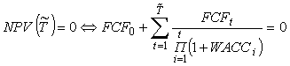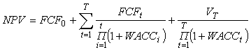где FCFt - свободный денежный поток в периоде t, FCF0 - свободный денежный поток на начало реализации инвестиционного проекта; WACCt - средневзвешенная требуемая доходность капитала, инвестированного в инвестиционный проект, на начало периода t, в годовом исчислении; VT - оценка стоимости активов, созданных в ходе осуществления инвестиционного проекта на момент времени Т; Т - момент времени, ограничивающий срок прямого прогнозирования свободных денежных потоков инвестиционного проекта.
