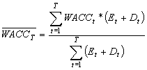 2.4. В каждом периоде FCFt=OCFt+ICFt, где OCFt - операционный денежный поток инвестиционного проекта в периоде t, a ICFt, - инвестиционный денежный поток в периоде t. Таким образом, оценка эффективности инвестиционного проекта предполагает для каждого периода t = 0, ... , T оценку операционного и инвестиционного денежных потоков инвестиционного проекта. 2.5. Средневзвешенная требуемая доходность капитала, инвестированного в инвестиционный проект, на начало периода t, - WACCt, - рассчитывается следующим образом: