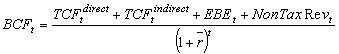 ЕВЕt - экономия расходов федерального бюджета, возникающая в периоде t в результате реализации инвестиционного проекта. Данная величина складывается из расходов, запланированных в федеральном бюджете, необходимость осуществления которых отпадет в случае реализации инвестиционного проекта. Оценка экономии расходов федерального бюджета производится на период бюджетного планирования (3 года) на основе данных инвестиционной и производственной программ инвестиционного проекта и одобренного Правительством Российской Федерации перспективного финансового плана. В случае если реализация инвестиционного проекта повлечет дополнительные расходы федерального бюджета, не покрываемые за счет средств Фонда, данный показатель уменьшается на величину дополнительных расходов. В случае если реализация инвестиционного проекта не повлечет ни дополнительных расходов, ни экономии расходов федерального бюджета, показатель EBEt принимается равным нулю; NonTaxRevt - доходы от использования федерального имущества, создаваемого в ходе реализации инвестиционного проекта. Данный показатель рассчитывается в зависимости от формы государственной поддержки следующим образом: - при государственной поддержке в форме софинансирования - как сумма доходов федерального бюджета от эксплуатации создаваемых в рамках инвестиционного проекта объектов инфраструктуры в периоде t. - при государственной поддержке в форме направления средств в уставные капиталы юридических лиц - как сумма дивидендов по акциям оператора инвестиционного проекта, находящимся в собственности государства, в периоде t; При государственной поддержке в форме предоставления государственных гарантий показатель NonTaxRevt в расчете ВСFt не учитывается (принимается равным нулю);