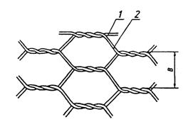 Рисунок 1. Схема шестиугольных ячеек сетки двойного кручения 1 - проволока кромки; 2 - основная проволока. В - среднее расстояние между скрутками, принимают за номер ячейки. Номинальный размер ячейки сетки, (см): № 6 - (6´8); № 8 - (8´10); № 10 - (10´12). Диаметр проволоки для изготовления сетчатых контейнеров, сборки и монтажа габионов приведен в таблице 1. Таблица 1 в миллиметрах