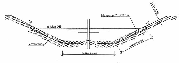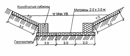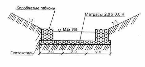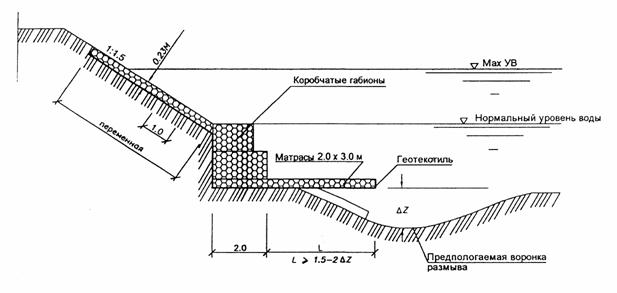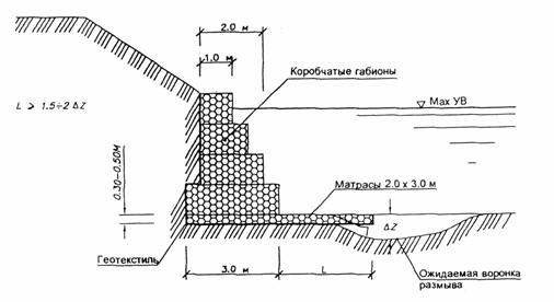 высотой более 7 - 5.4. Требования к габионным сооружениям по защите береговых откосов5.4.1. Исходные данные для проектирования: - скорость течения водного потока принимается по данным гидрометеопостов и (или) по расчетам в соответствии с СНиП 2.01.14; - глубина постоянного или временного подтопления принимается по данным измерений гидрометеопостов и (или) по расчетам уровня воды на пике прохождения паводка с обеспеченностью соответствующей классу защищаемого сооружения, объекта или территории; - расчетная высота волны определяется в соответствии с СНиП 2.06.04 с учетом средней глубины потока, расчетной средней длины волны, конфигурации защищаемой береговой черты и ветрового разгона. 5.4.2. Средний размер каменного материала и высота габионов по защите откосов берегов от размыва при отсутствии ветровых волн принимается в зависимости от скорости водного потока в соответствии с требованиями, указанными в таблице 2. Таблица 2