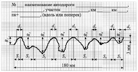 3.4 Средняя высота выступов P определяется как среднее из высот выступов pi, средняя величина разброса выступов F, мм определяется как среднее между разницей высот зерен щебня при переворачивании полосы миллиметровки с очерченным контуром профиля шероховатости, аналогично определению параметров впадин.