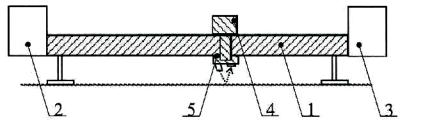 1 - полая балка с приводом от реверсивного двигателя и ходовым винтом; 2 - блок с приборами и пунктом управления (электронное хранилище информации, инклинометр, АЦП; 3 - мотор-редуктор; 4 - подвес датчика, передвигающийся вдоль балки 1 с помощью пары винт-гайка; 5 - датчик