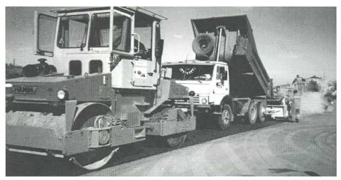 7.5.6 Температура при распределении битума: - для вязких битумов марок БНД 60/90, БНД 90/130 в пределах +150° - +160°С; - для марок БНД 130/200 в пределах +100° - +130°С; - для полимербитумных вяжущих в пределах +140° - +160°С. Температуру и концентрацию эмульсии устанавливают в зависимости от погодных условий следующим образом: - при температуре воздуха ниже +20°С эмульсия должна иметь температуру +40 - +50°С (при концентрации битума в эмульсии 55–60 %). Подогрев эмульсии до такой температуры осуществляется непосредственно автогудронатором; - при температуре воздуха выше +20°С эмульсию можно не подогревать (при концентрации битума в эмульсии 50 %). 7.5.7 Щебень необходимо распределять сразу после розлива битума (не допуская его загустевания). Дополнительного нагрева щебня перед распределением не требуется. Распределение щебня производится самоходными или навесными щебнераспределителями, осуществляющими распределение “в одну щебёнку” при плотном расположении по поверхности обрабатываемого покрытия. Не допускаются пропуски и чрезмерное распределение щебня по поверхности. После прохода распределителя щебня окончательное выравнивание и исправление поверхности осуществляется вручную гладилками и скребками. 7.5.8 Сразу после россыпи щебня производится уплотнение гладковальцовыми катками массой 6-8 тонн (4-5 проходов по одному следу). Затем тяжелыми гладковальцовыми катками массой 10-12 тонн (2-4 прохода по одному следу). Для лучшего проявления шероховатой структуры целесообразно последнюю стадию уплотнения производить гладковальцовыми катками с обрезиненными вальцами. 7.5.9 При использовании битумных эмульсий работы ведутся в следующем порядке: - смачивание обрабатываемого покрытия водой (возможно с активирующими добавками) в количестве 0,4-0,5 л/м2; - розлив эмульсии по покрытию в количестве 30 % от расхода, указанного в таблице 8; - распределение 70 % щебня от расхода, указанного в таблице 10 (разрыв не более 20 м с интервалом во времени не более 5 мин. от момента розлива эмульсии); - розлив оставшейся эмульсии; - распределение оставшегося щебня; - укатка катками массой 6-8 тонн по 3-4 прохода по одному следу (начало укатки должно совпадать с началом распада эмульсии); - уход за устроенной поверхностью. 7.5.10 Уход за поверхностной обработкой осуществляется в течение первых двух-четырех суток после устройства и заключается в регулировании движения (последовательные проходы автотранспорта по определенным продольным полосам со скоростью не более 40 км/час) и систематическом наметании неприжившегося щебня механическими щетками с кромки на покрытие. По истечении срока ухода неприжившийся щебень должен быть удален с поверхности покрытия. В случае использования анионактивной эмульсии движение следует открывать не ранее чем через одни сутки после устройства поверхностной обработки. 7.5.11 При назначении расходов материалов для устройства шероховатого слоя методом поверхностных обработок рекомендуется также использовать Индивидуальные элементные сметные нормы и расценки на работы по ремонту автомобильных дорог с использованием новой техники и технологий (2003 г.). 7.6 Устройство поверхностных обработок с использованием литых эмульсионно-минеральных смесей (ЛЭМС, “Сларри Сил”, микросурфасинг и др.): Материалы для устройства ЛЭМС выбираются с учетом ВСН 27-76, ТУ 218 РСФСР 536-85, Пособ