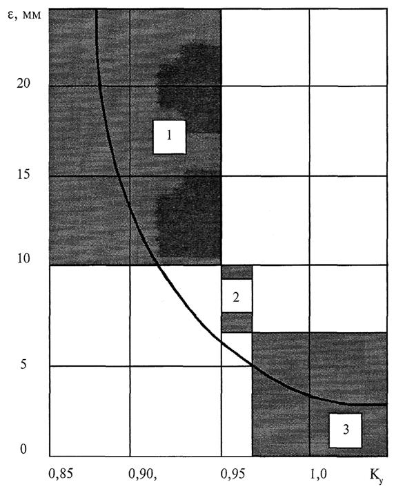 Рис. 1.4. Влияние коэффициента уплотнения Ку земляного полотна из связного грунта на ровность е и состояние асфальтобетонного покрытия: 1 - разрушенное; 2 - незначительные деформации; 3 - качественное Запрещается строительство асфальтобетонного покрытия при отсутствии актов освидетельствования предшествующих скрытых работ. Заданный уровень качества асфальтобетонных покрытий может быть обеспечен только квалифицированной службой лабораторного контроля при условии полной комплектации производства необходимыми техническими средствами оперативного контроля. Особенностью выбора и применения технических средств контроля качества асфальтобетонных покрытий является оценка меры их практической применимости в соответствии с допусками и требованиями к однородности применяемых материалов и собственно покрытию. При выборе средств контроля качества должно выполняться условие δk≤δпр≤кΔ, где δ - расчетная суммарная погрешность выбираемого метода; δпр - предельная погрешность контроля; к - коэффициент, зависящий от цели контроля, характера объекта и значимости контролируемого параметра в оценке качества работ; Δ - допуск контролируемого параметра (поле допуска при двустороннем ограничении параметра). Суммарная погрешность метода контроля включает в себя по источникам возникновения четыре группы (инструментальные - δи, методические - δм, погрешности от влияния внешних условий - δв и субъективные - δс) и рассчитывается их квадратичным суммированием: