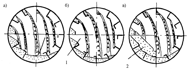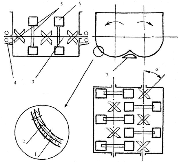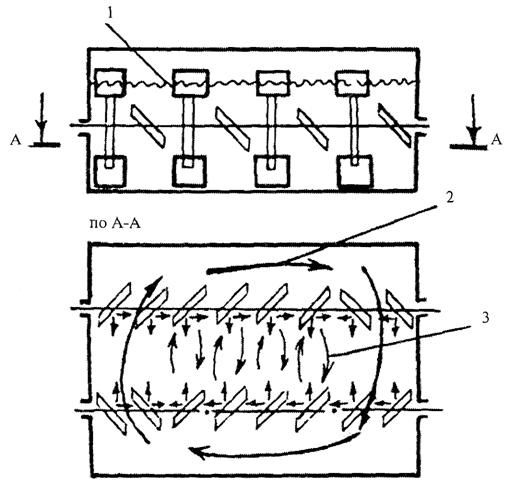 двухвального лопастного смесителя: К смесителю предъявляются следующие требования: • равномерно и за короткий промежуток времени распределить компоненты смеси по массе замеса; • обеспечить равномерное распределение битума по поверхностям минерального материала; • оперативность разгрузки смесителя. На скорость циркуляции смеси оказывают влияние: схема расстановки лопастей; параметры смесителя, которые зависят от формы корпуса смесителя, оцениваемой отношением длины корпуса смесителя L к его ширине В(ψ=L/B). В зависимости от способа расстановки лопастей на валах смесителя различают противоточную и поточно-контурную схемы движения смеси в корпусе смесителя. В настоящее время в основном применяется последняя схема, когда в корпусе смесителя (рис. 3.12) лопасти на одном валу установлены так, что смещают смесь от левого торца смесителя к правому, а в конце одна - две пары лопастей установлены с обратным углом для смещения смеси во встречном направлении. На втором валу лопасти установлены в обратном направлении и смещают смесь от правого торца смесителя к левому. Рис. 3.12. Поточно-контурная