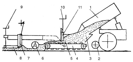 схема асфальтоукладчика: Для изменения ширины укладываемой полосы предусмотрены уширители шнеков, трамбующего бруса и виброплиты. Обычно асфальтоукладчики оборудуются системой автоматического управления, которая обеспечивает контроль и регулирование продольного и поперечного уклонов поверхности устраиваемого покрытия. По типу ходового устройства асфальтоукладчики классифицируют на гусеничные, колесные и комбинированные. Технические характеристики асфальтоукладчиков приведены в прил. 21. Самоходное шассиСамоходное шасси выполняет функции приема асфальтобетонной смеси из самосвалов, перемещения ее к шнековым распределителям. Оно приводится в движение двигателем, который обеспечивает поступательное рабочее движение машины вперед. На шасси навешиваются: толкающие ролики, загрузочный бункер, заслонка (затвор) для регулирования количества смеси, поступающей на основание, и питатель. Упорные роликиУпорные ролики расположены перед бункером асфальтоукладчика и предназначены для толкания автосамосвала впереди машины. Ролики должны быть чистыми и свободно вращаться, так как в противном случае создаются дополнительные силовые нагрузки на асфальтоукладчик, смещающие ось его движения. Приемный бункер асфальтоукладчика Бункер предназначен для приема и временного хранения асфальтобетонной смеси. Его ширина должна быть больше ширины кузова автосамосвала. Чтобы исключить давление самосвала на переднюю часть асфальтоукладчика, необходимо использовать такие автосамосвалы, у которых поднятый кузов при разгрузке не будет опираться на бункер. Для очистки бункера от асфальтобетонной смеси его боковые стенки складываются с помощью гидроцилиндров. Зачастую машинисты асфальтоукладчиков перед разгрузкой автосамосвала, для предотвращения высыпания смеси на основание, с помощью боковых стенок бункера перемещают всю смесь к шнекам. Это приводит к тому, что после загрузки бункера задняя часть питателя остается без смеси и в результате нарушаются сплошность и толщина укладываемого слоя. Частота подъема стенок бункера зависит от полноты загрузки бункера, температуры смеси и погодных условий. Стенки следует поднимать до того, как смесь, скопившаяся в углах, остынет настолько, что образовавшиеся комья не будут разрушаться при попадании их на питатель и к шнекам. В любом случае приемный бункер должен быть загружен не ниже уровня заслонки 11. Скребковый питательНа дне бункера находятся скребковые питатели для перемещения асфальтобетонной смеси к распределительным шнекам. Правый и левый питатели имеют независимый привод и могут перемещать различное количество смеси. Такая конструкция позволяет укладывать покрытие на различных радиусах кривых. Скорость передвижения ленты питателя зависит от скорости движения асфальтоукладчика. Регулирующие заслонкиВ задней части бункера находятся заслонки для регулирования количества асфальтобетонной смеси, подаваемой к шнекам. Величина их открытия зависит от толщины укладываемого слоя покрытия и устанавливается в соответствии с таблицей, расположенной обычно на капоте двигателя. ШнекиШнеки предназначены для равномерного распределения смеси по всей ширине укладываемой полосы. Качество распределения смеси шнеками зависит от точности выбранного положения регулирующих зас