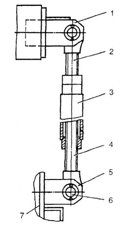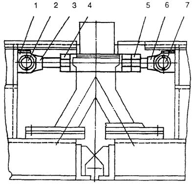 Для обеспечения качества строительства асфальтобетонного покрытия необходимо периодически производить регулирование положения трамбующего бруса. Оно осуществляется в вертикальной и горизонтальной плоскостях. Установка трамбующего бруса по отношению к плите в вертикальной плоскости считается правильной, если его нож в крайнем нижнем положении будет ниже основания плиты на 0,4 мм. Если этот допуск более 0,4 мм, то плита не будет выглаживать поверхность покрытия и на ней останутся следы от трамбующего бруса. Если нож трамбующего бруса выше основания плиты, то происходит налипание смеси к плите и образование трещин на поверхности покрытия. Регулирование положения трамбующего бруса осуществляется путем изменения количества прокладок под подшипниками эксцентрикового вала. В горизонтальной плоскости регулируется зазор между ножом трамбующего бруса и торцом плиты. Его величина должна находиться в пределах 0,5…1,0 мм. Регулирование установки трамбующего бруса производится отжимным болтом. Рис. 5.3. Регулятор