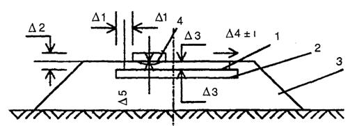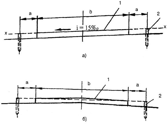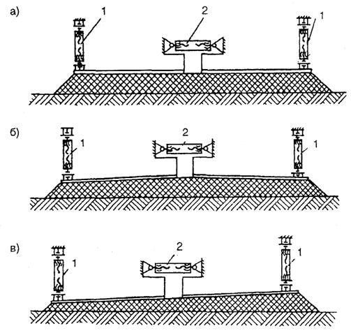установки нивелировочных реек: Чтобы струна проходила на одинаковой высоте от реек, установленных под отметку, регулируют ее положение в продольном профиле с помощью деревянного шаблона. Затем проверяют положение струны в плане. Для соблюдения требуемого профиля покрытия копирную струну устанавливают с двух сторон покрытия. Однако при укладке второй полосы эту струну может заменить готовое покрытие, по которому скользит рычаг преобразователя системы автоматического управления. При укладке полосы покрытия шириной не более 4,5…5,0 м система автоматики асфальтоукладчика может работать с одним копиром (струна, лыжа). В случае применения асфальтоукладчиков без системы автоматического управления, для соблюдения требуемого профиля и отметок непосредственно перед укладкой выставляют контрольные маяки из асфальтобетонной смеси, слегка уплотненной; толщина маяков должна быть равна толщине укладываемого слоя в неуплотненном состоянии. Если асфальтоукладчик не оборудован скользящими формами, то для упора укладываемой смеси устанавливают брусья, которые укрепляют со стороны обочины металлическими анкерами. Рис. 5.10. Расположение