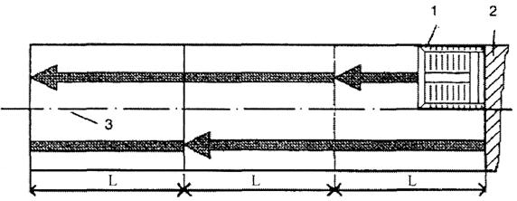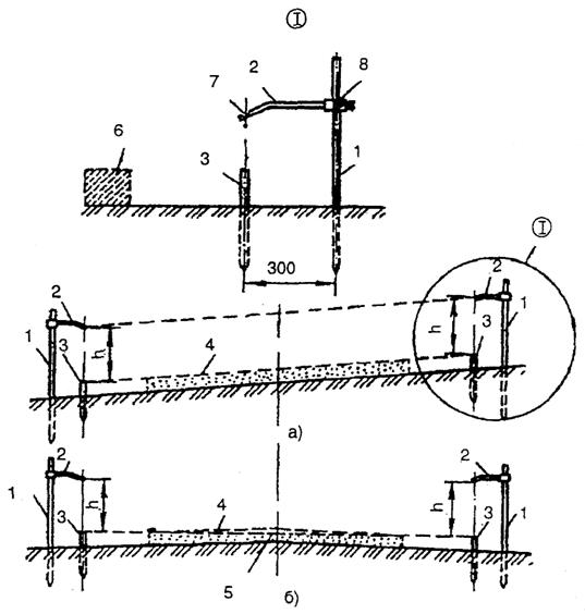 рабочий орган асфальтоукладчика: В начале и конце захватки устанавливают нивелировочные рейки 2 (рис. 5.9). Затем через каждые 15 м в створе устанавливают все промежуточные рейки. Для определения уровня покрытия как в поперечном, так и в продольном направлениях ведут высотную разбивку (выставляют рейки 2 под нивелир и закрепляют). При окончательной установке верх рейки должен находиться в одной плоскости с поверхностью покрытия. Рейки обозначают линии копирных струн в плане и служат реперами, от которых измеряют высоту h установки струны (рис. 5.10). После этого устанавливают стойки 1, на них надевают струбцины 8, в которых выполнены два отверстия: одно для стойки, другое для поперечной штанги. В прорези 7 на конце штанги проходит струна. Положение прорези над рейками по высоте измеряют шаблоном, а совмещение прорезей со створом реек проверяют по теодолиту. Затем производят натяжение копирных струн. Для этого устанавливают натяжной барабан 1 и закрепляют на якоре перед первой стойкой на расстоянии 10…12 м и 30 см в сторону от линии нивелировочных реек 3. Натягивают копирную струну вручную, насколько это возможно, и прикрепляют ее к барабану. На нем оставляют запас струны 10…12 м. После этого производят натяжку струны барабаном и вставляют ее в прорези поперечных штанг 4. Струна должна лежать в прорезях свободно и не выпадать из них. Рис. 5.9. Схема