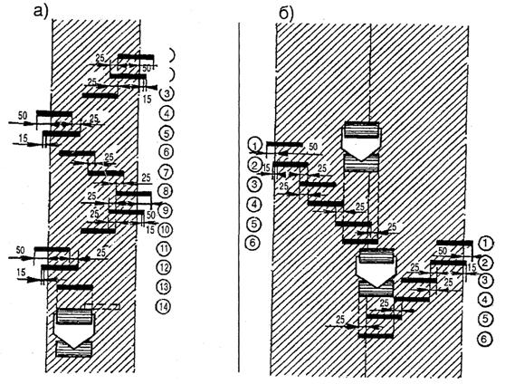 Укладку асфальтобетонных смесей следует осуществлять асфальтоукладчиком на всю ширину покрытия или на отдельных полосах, ширина которых кратна ширине покрытия. В последнем случае, уложив одну полосу, переходят на соседнюю, пока чрезмерно не остыла кромка ранее уложенной полосы (рис. 5.7).