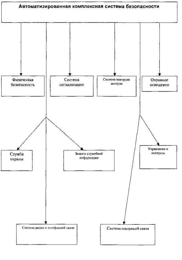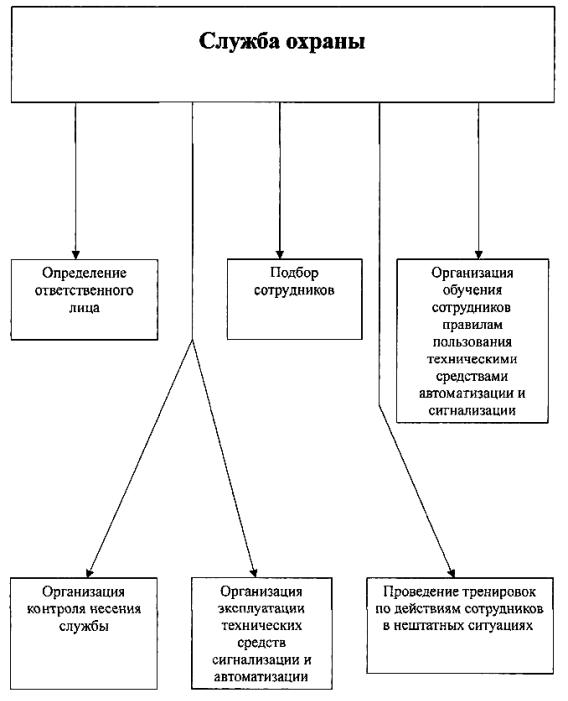 Рис. 13 4.8. Организация службы безопасности объекта, оборудованного автоматизированной комплексной системой безопасности (см. рис. 14).Наиглавнейшим человеческим фактором в части эффективной эксплуатации созданной автоматизированной комплексной системы безопасности является организация службы безопасности. Организация службы безопасности строится на основных составляющих; 1. Определение ответственного лица за организацию эксплуатации АКСБ. 2. Подбор сотрудников, занятых эксплуатацией автоматизированной комплексной системы безопасности. 3. Систематическое обучение сотрудников всех уровней правилам пользования АКСБ. 4. Организация контроля за несением службы охранниками службы безопасности. 5. Организация эксплуатации технических средств автоматизированной комплексной системы безопасности. 6. Проведение систематических тренировок по отражению разбойных нападений и действий личного состава предприятия в условиях чрезвычайной ситуации.