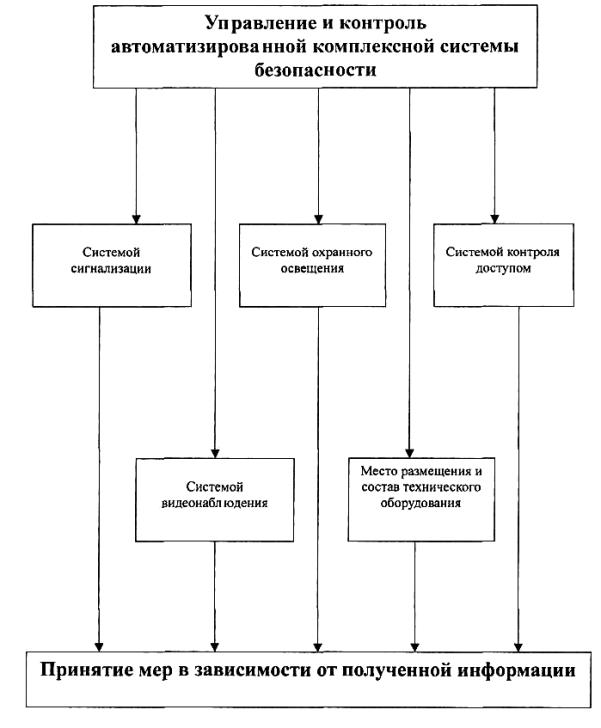 Проведение специальных организационных мероприятий: - По хранению и учёту служебной документации, - По осмотру служебных помещений, - По оборудованию помещений специальной защитой, - По порядку приёма и сдачи помещений под охрану, - По разграничению доступа и контролю к внутренним средствам связи, сетям IBM, с помощью подсистем систем сигнализации. Рис. 11 4.6. Управление проектируемой системой безопасности (см. рис. 12)В понятие управления и контроля за работой автоматизированной комплексной системой безопасности входят: - Управление системой сигнализации, - Управление системой охранного освещения, - Управление системой разграничения и контроля доступа, - Управление системой видеонаблюдения. Место размещения центрального поста и состав технического оборудования определяется дополнительно в зависимости от условий функционирования объекта.