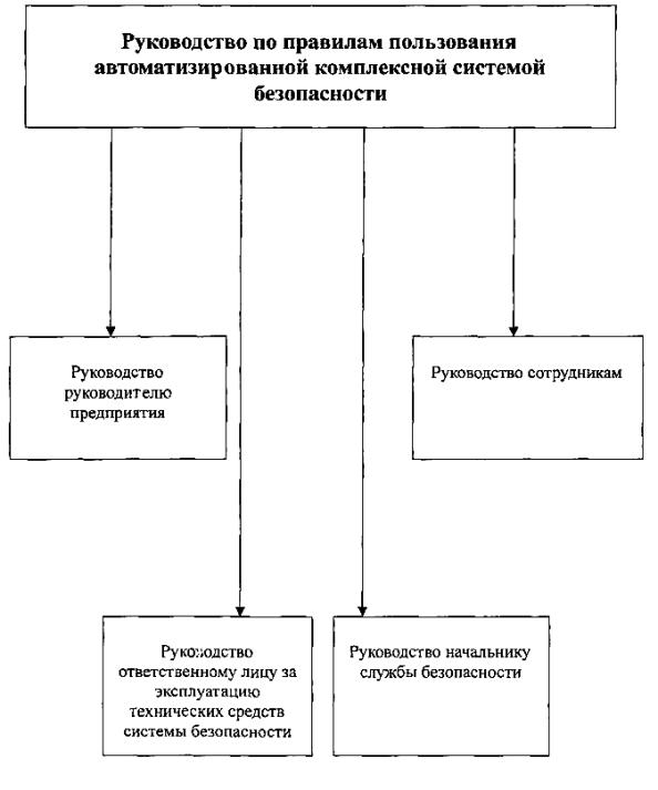 Рис. 12 4.7. Руководство по правилам пользования АКСБ (см. рис. 13).Завершающий и один из главных моментов, который обуславливает успешную эксплуатацию, созданную автоматизированную комплексную систему безопасности, - это изготовление инструкции по правилам пользования системой для разного уровня пользования. Подробным образом составляются инструкции по правилам пользования системой для: - Руководителя предприятия, - Начальника службы безопасности, - Охранников, - Сотрудников.