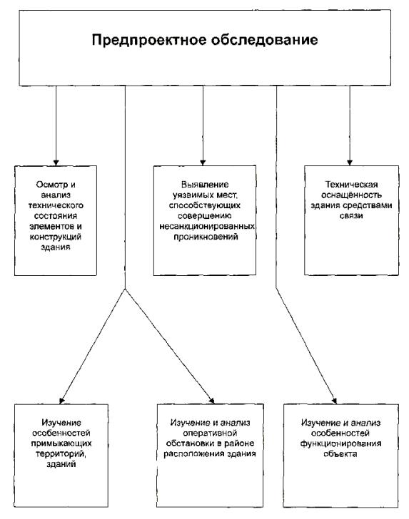 Рис. 14 Глава 5. Основные требования и состав документации при проектировании автоматизированной комплексной системы безопасности5.1. Основной пакет документов для проектирования АКСБ.Основные документы, регулирующие юридические отношения между заказчиком и подрядчиком при проектировании АКСБ: 1. Договор на изготовление научно-технической продукции. 2. Смета на выполнение проектных работ. 3. Акт - смета Ф-2 выполненных проектных работ. 4. Задание на проектирование АКСБ. 5. Акт выполненных проектных работ. 6. Акт передачи заказчику изготовленной продукции. 5.2. Предпроектное обследование объекта, подлежащего оборудованию автоматизированной комплексной системой безопасности (см. рис. 15).Предпроектное обследование объекта, подлежащего оборудованию автоматизированной комплексной системой безопасности, содержит следующие моменты: • Осмотр и анализ технического состояния элементов и конструкций здания, • Изучение особенностей примыкающих территорий и зданий, • Изучение и анализ оперативной обстановки в районе расположения здания, • Выявление уязвимых мест, способствующих совершению противоправных действий, • Уровень оснащённости средствами связи.