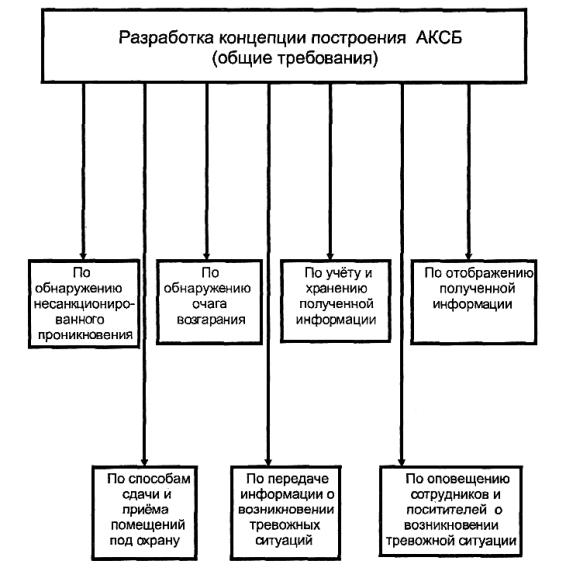 Рис. 15 5.3. Разработка концепции построения автоматизированной комплексной системы безопасности (см. рис. 16).При разработке концепции построения проектируемой АКСБ разрабатываются фактически будущая идеология работы системы в целом. Определяются: Условия по обнаружению несанкционированного проникновения на защищаемый объект, - Условия по обнаружению очага возгорания. - Условия учёта и хранения получаемой информации от составных частей АКСБ. - Форма и вид отображения получаемой информации от составных частей АКСБ. - Условия и способы сдачи и приёма служебных помещений под охрану. - Способы передачи информации о возникновении тревожных ситуаций. - Способы оповещения сотрудников и посетителей о возникновении пожара, тревожной ситуации или чрезвычайной ситуации. Результаты работы позволят точно определить условия обнаружения, места выдачи, способы передачи и отображения, хранения и учёта всей поступающей информации. После этого автоматически определятся технические параметры для подбора соответствующего оборудования.
