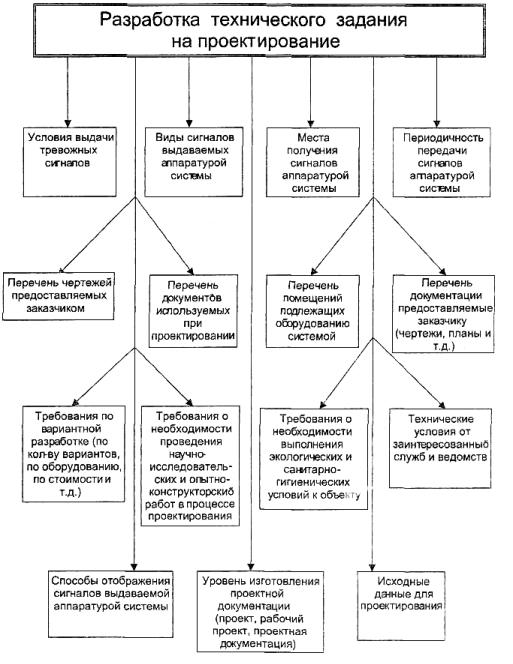Рис. 16 5.4. Разработка технического задания для изготовления проектной документации автоматизированной комплексной системы безопасности (см. рис. 17).Успех изготовления проекта, монтажа автоматизированной комплексной системы безопасности, её эксплуатация, эффективность, надёжность на 99% зависит от качества разработки задания на проектирование. Основные составные части задания на проектирование: - Условия выдачи тревожных сигналов - Виды сигналов выдаваемых аппаратурой системы - Места получения сигналов аппаратурой системы - Места получения сигналов аппаратурой системы - Периодичность передачи сигналов аппаратурой системы - Перечень чертежей, предоставляемых заказчиком - Перечень документов, используемых при проектировании - Перечень помещений, подлежащих оборудованию системой - Перечень документации, предоставляемой заказчику (чертежи, планы и т.д.) - Требования по вариантной разработке (по кол-ву вариантов, по оборудованию, по стоимости и т.д.) - Требования о необходимости проведения научно-исследовательских и опытно-конструкторских работ в процессе проектирования - Требования о необходимости выполнения экологических и санитарно-гигиенических условий к объекту - Технические условия от заинтересованных служб и ведомств - Способы отображения сигналов выдаваемой аппаратурой системы безопасности - Уровень изготовления проектной документации (проект, рабочий проект, проектная документация) - Исходные данные для проектирования