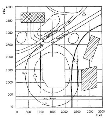 Используемая в расчетах при оценке достаточности природоохранных мероприятий скорость ветра U*, превышаемая в данной местности в среднем многолетнем режиме в 5 % случаев запрашивается в территориальных органах Роскомгидромета или рассчитывается по методике [22] на основе данных по климатическому справочнику [24]. Среднеквартальную скорость ветра, применяемую для определения зоны загрязнения, также запрашивают в территориальных органах Роскомгидромета или определяют по справочнику. В противном случае возможен вариант автоматического выбора ее программой расчета УПРЗА, если она не задается. Пример расчета концентрации оксидов азота в атмосфере дан в табл. 23. 4.4. Расчет размеров санитарно-защитной зоны4.4.1. Для КС (КЦ) должна быть установлена санитарно-защитная зона (СЗЗ), размеры которой определяются классом опасности рассматриваемого производства. Достаточность СЗЗ подтверждается расчетами прогнозируемых уровней загрязнения, а также результатами лабораторных исследований атмосферного воздуха в районах размещения аналогичных действующих КС (КЦ). 4.4.2. При корректировке размера СЗЗ с учетом преобладающих направлений ветра (Р > 12,5 %) запрещается сокращение по направлениям, имеющим Р < 12,5 %. 4.4.3. Границы и размеры санитарно-защитной зоны проверяются расчетом в соответствии с требованиями ОНД-86 фактического загрязнения атмосферного воздуха (существующее положение) и с учетом перспективы развития предприятия (реконструкции, изменения производительности, ликвидации ряда производств, строительство новых технологических объектов) [25]. Границей зоны загрязнения является линия равных концентраций, за которой общая концентрация по каждому ингредиенту выброса или по сумме ингредиентов, обладающих эффектом суммации, не превышает максимально разовую ПДК в атмосфере населенных мест СОБЩ £ ПДК. (17) Граница СЗЗ по условиям охраны атмосферного воздуха отсчитывается от крайних точечных или организованных источников выделения вредных веществ на предприятии (а не от ограды предприятия или наиболее мощных источников.) [26]. Полученные по квартальным расчетам размеры зон загрязнения уточняются отдельно для различных направлений ветра и среднеквартальной розы ветров района расположения предприятия.