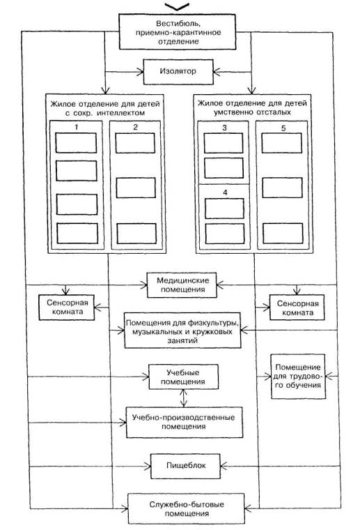 1 - вестибюль; приемно-карантинное отделение; 2 - жилая ячейка типа 1а; 3 - жилая ячейка типа 1б; 4 - жилая ячейка типа 1в; 5 - класс; 6 - медицинская служба; 7-помещения оздоровительной физкультуры; 8 - столовая; 9 - лечебно-трудовая мастерская (ЛТМ), мастерские трудового обучения; 10 - учебно-производственная мастерская (УПМ); 11 - помещения администрации; 12 - жилая ячейка типа 2а; 13 - жилая ячейка типа 2б; 14 - жилая ячейка типа 2в; 15 - сенсорное помещение; 16 - изолятор; 17 - жилая ячейка типа 2в