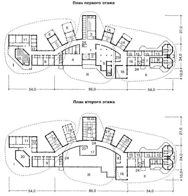 I - отделение для детей-инвалидов с сохранным интеллектом; II - отделение для детей умственно отсталых; III - центральная в плане группа помещений, рассчитанных на обслуживание двух самостоятельных, обособленных друг от друга отделений для детей-инвалидов с сохранным интеллектом и детей умственно отсталых 1 - вестибюль с гардеробом; 2 - кабинет директора; 3 - медицинская служба; 4 - спортивные и физкультурно-оздоровительные учреждения; 5 - блок питания; 6 - приемно-карантинное отделение; 7 - изолятор; 8 - жилая ячейка типа 1в; 9 - классы; 10 - актовый зал; 11 - профессиональные мастерские; 12 - лаборантские; 13 - медицинские процедурные кабинеты; 14 - жилая ячейка типа 2в; 15 - помещения для занятий; 16 - мастерские трудотерапии; 17 - сенсорные помещения; 18 - жилая ячейка типа 1а; 19 - жилая ячейка типа 1б; 20 - солярий; 21 - жилая ячейка типа 2а; 22 - жилая ячейка типа 2б; 23 - место для кресел-колясок; 24 - лифт; 25 - административно-служебные помещения; 26 - прачечная