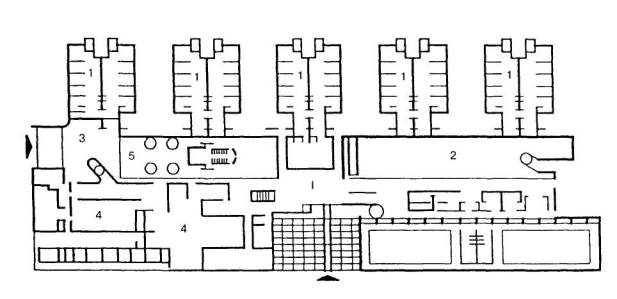1 - жилые отделения (блоки); 2 - школа, профессиональные и трудовые мастерские; 3 - административно-бытовые помещения; 4 - медицинская служба; 5 - пищеблок