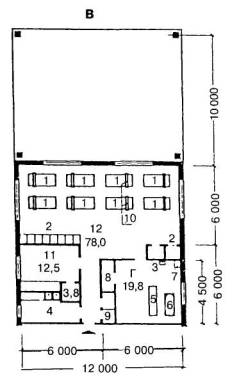 A. Планировочная схема жилой ячейки типа 1а для дошкольников 1 - раздевальная; 2 - игровая; 3 - столовая; 4 - буфетная с мойкой; 5 - класс; 6 - комната воспитателя; 7 - санузел; 8 - комната для сушки одежды и обуви; 9 - гладильная; 10 - спальная комната на 6 мест; 11 - спальная комната на 4 места; 12 - кладовая демонстрационного и подсобного материала Б. Планировочная схема жилой ячейки типа 1б для подростков и старшеклассников1 - раздевальная; 2 - спальная комната на 4 места; 3 - спальная комната на 3 места; 4 - комната воспитателя с кладовой личных вещей; 5- комната отдыха; 6 - буфетная; 7 - комната для занятий с кладовой; 8 - туалет; 9 - умывальник; 10 - комната для сушки одежды и обуви B. Планировочная схема жилой ячейки типа 1в для лежачих детей-инвалидов с сохранным интеллектом 1 - кровать (200×90 см); 2 - встроенный шкаф для спальных принадлежностей и чистого белья; 3 - умывальник (60×40 см); 4 - буфет-мойка (180×60 см); 5 - каталка (225×60 см); 6- ванна (170×70 см); 7 - слив (45×50 см); 8 - встроенный шкаф для суден; 9 - шкаф для хозяйственных принадлежностей; 10 - надкроватный столик; 11 - комната воспитателя с кладовой для демонстрационного школьного материала; 12 - спальная комната на 8 мест