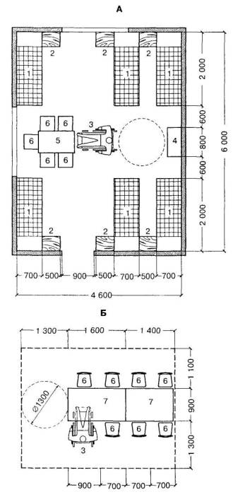 А. Планировочная схема спальной комнаты на 6 мест для детей-инвалидов младших групп дошкольников; Б. Планировочная схема обеденного места в столовой с буфетной 1 - кровать 190(200)×70 см; 2 - тумбочка 40×50 см; 3 - инвалидная коляска; 4 - шкаф комбинированный; 5 - стол 100×60 см; 6 - стул 40×40 см; 7 - стол детский обеденный 140(160)×90 см
