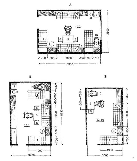А - четырехместная спальная комната; Б - трехместная спальная комната; В - двухместная спальная комната 1 - кровать 190×70 см; 2 - диван; 3 - тумбочка 40×80 см; 4 - тумбочка 40×40 см; 5 - стол 60×100 см; 6 - стул 40×40 см; 7 - кресло 50×50 см; 8 - торшер; 9 - банкетка; 10 - инвалидная коляска; 11 - комбинированный шкаф