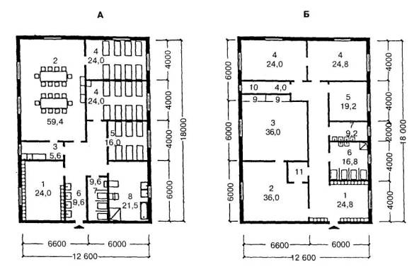 A Планировочная схема жилой ячейки типа 2а для младшей группы детей-инвалидов 1 - раздевальная; 2 - групповая-столовая; 3 - буфетная с мойкой; 4 - спальная комната на 8 мест; 5 - спальная комната на 6 мест; 6 - умывальная; 7 - туалетная; 8 - ванная Б. Планировочная схема жилой ячейки типа 2б для детей-инвалидов подростковой и старшей трудового обучения групп 1 - раздевальная; 2 - комната дневного пребывания; 3 - класс; 4 - спальная комната на 8 мест; 5 - спальная комната на 6 мест; 6 - туалетная; 7 - умывальная; 8 - ванна; 9 - шкаф для демонстрационного материала; 10 - бытовая кладовая; 11 - буфетная с мойкой B. Планировочная схема жилой ячейки типа 2в для необучаемых, лежачих детей-инвалидов1 - спальная комната на 8 мест; 2 - спальная комната на 6 мест; 3 - ванная со шкафом для суден; 4 - буфетная с мойкой; 5 - кровать (200×90 см); 6 - встроенный шкаф для спальных принадлежностей и чистого белья; 7 - умывальник (60×40 см); 8 - каталка (224×60 см); 9 - ванна; 10 - слив; 11 - встроенный шкаф для суден; 12 - шкаф для хозяйственных принадлежностей; 13 - надкроватный столик