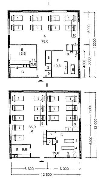 I - планировочная схема жилых комнат жилой ячейки типа 1в для лежачих детей с сохранным интеллектом А - спальная комната; Б - комната воспитателя; В - буфетная с мойкой; Г - ванная со шкафом для суден 1 - кровать (200×90 см); 2 - встроенный шкаф для спальных принадлежностей и чистого белья; 3 - умывальник; 4 - буфетная с мойкой (180×60 см); 5 - каталка; 6 - ванна; 7 - слив (45×50 см); 8 - встроенный шкаф для суден; 9 - шкаф для хозяйственных принадлежностей; 10 - надкроватный столик; 11 - кладовая для демонстрационного школьного материала II - планировочная схема жилых комнат жилой ячейки типа 2а для лежачих детей умственно отсталых А - спальные комнаты на 6 и 8 чел.; Б - ванная со шкафом для суден; В - буфетная с мойкой 1 - кровать (200×90 см); 2 - встроенный шкаф для спальных принадлежностей и чистого белья; 3 - умывальник; 4 - каталка; 5 - ванна; 6 - слив (45×50 см); 7 - встроенный шкаф для суден; 8 - шкаф для хозяйственных принадлежностей; 9 - надкроватный столик