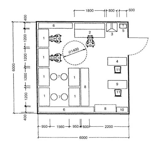 Планировочная схема лечебно-трудовой мастерской по ремонту аппаратуры и бытовой техники 1 - стол монтажный; 2 - стенд испытательный; 3 - стол с вытяжкой; 4 - стол мастера; 5 - мойка; 6 - стеллаж для материалов; 7 - табурет с регулируемым сиденьем; 8 - стеллаж мастера; 9 - стол медсестры; 10 - шкаф медицинский одностворчатый; 11 - стул Приложение АТермины и определенияДом-интернат для детей инвалидов, имеющих отклонение в развитии, является учреждением стационарного содержания детей с сохранным интеллектом (3-18 лет) и детей умственно отсталых (4-18 лет). Жилое отделение - часть здания учреждения дома-интерната для детей-инвалидов, состоящая из нескольких жилых ячеек, объединенных общими на отделение помещениями. Жилая ячейка - часть жилого отделения дома-интерната для детей-инвалидов. Жилая ячейка состоит из жилых комнат - спальни, групповой комнаты для занятий и общественных помещений - санитарно-гигиенических помещений, раздевальной, хозяйственных помещений, буфетной. Комната позиционирования - является медицинским помещением для детей-инвалидов. Комната позиционирования используется для разнообразных терапевтических поз-укладок в зависимости от медицинских показаний ребенка-инвалида. Сенсорная комната - является медицинским реабилитационным помещением для детей-инвалидов с различными физическими и умственными недостатками. Сенсорная комната предназначается для психического и физического развития нуждающихся в реабилитации детей-инвалидов. Сенсорная комната оснащается аппаратурой с набором различных управляемых переключателей, сенсорной панелью, стимулирующей двигательные, визуальные и акустические эмоции. Стационарные учреждения социального обслуживания детей-инвалидов - учреждения, состоящие из жилых помещений для постоянного проживания в домах-интернатах детей-инвалидов с различной степенью инвалидности и комплекса служб социально-бытового и медицинского и учебно-воспитательного назначения для проживающего в учреждении контингента. Функциональная зона - пространство для осуществления одного или нескольких схожих процессов, ограниченных какими-либо границами различных зон, характеризующихся определенными признаками. Эргонометрические параметры - параметры человека в условиях покоя, движения или какой-либо деятельности. Приложение Б
