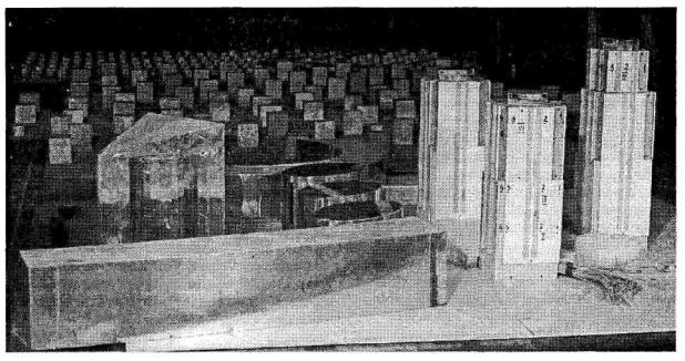 Рисунок 4.6. Картина течения внутри плотной застройки 4.9 Основные требования к проведению модельных аэродинамических испытаний4.9.1 Аэродинамические характеристики зданий и сооружений существенно зависят от их геометрических формы и размеров, от характера и структуры набегающего потока, от окружающей застройки и от некоторых других факторов. В связи с этим, за исключением одиночно стоящих зданий, схемы которых приведены в приложении 4 СНиП 2.01.07, аэродинамические коэффициенты сил, моментов, внутреннего и внешнего давлений, а также числа Струхаля (при оценке резонансного вихревого возбуждения, см. п. 4.4) должны определяться на основе данных модельных испытаний, проводимых в специализированных аэродинамических трубах. При проведении модельных аэродинамических испытаний должны быть выполнены определенные условия (критерии) подобия, которые обеспечивают получение наиболее достоверной информации о действующих на здание ветровых нагрузках. Наиболее существенными критериями являются следующие: - геометрическое подобие; - подобие структуры потока в аэродинамической трубе реальным ветровым режимам; - моделирование ситуационного плана в радиусе r ≥ h (h - высота здания); - подобие основных динамических свойств модели и здания (при экспериментальном определении динамической реакции). 4.9.2 Моделирование турбулентной структуры реальных ветровых режимов, включая вертикальный градиент средней скорости ветра и энергетический спектр ее пульсационной составляющей, как правило, может быть выполнено только в аэродинамических трубах метеорологического типа с длинной рабочей частью. Здесь структура потока соответствует так называемой пристеночной турбулентности и формируется за счет тех же механизмов, что и в натурных условиях, т.е. в результате взаимодействия с подстилающей поверхностью (полом) трубы и за счет обтекания расположенных на ней элементов шероховатости (рис. 4.7). Меняя их размеры и взаимное расположение, можно получать различные градиентные потоки, в том числе и соответствующие местностям типов А, В и С (по классификации СНиП). В этой связи можно отметить, что требование о необходимости моделирования естественных ветровых режимов (погранслоя атмосферы) существует в современных нормах большинства стран (см., например, Еврокод [14], нормы США [15], Австралии [16], Японии [17]).