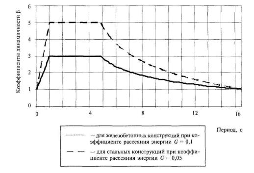 зарегистрированных на расстоянии 1400 км от эпицентра 7.2.6 При расчете в частотной области линейно-спектральным методом по отдельным формам колебаний здания исходными данными являются параметры, полученные обработкой акселерограмм: - интенсивность воздействия; - спектральный состав воздействия; - ориентация воздействия; - уровень ротации воздействия. 7.2.7 Интенсивность воздействия определяется коэффициентом I и устанавливается в соответствии с расчетной балльностью, для пяти баллов I = 0,025 и для шести баллов I = 0,05. 7.2.8 Спектральный состав определяется коэффициентами динамичности в зависимости от периодов колебаний здания по графикам рис. 7.3.