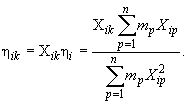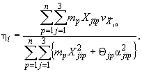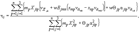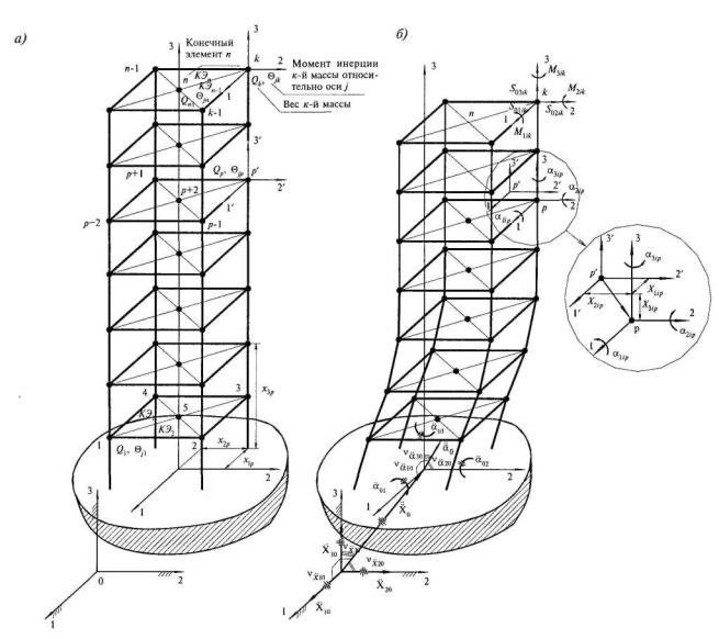 где Xjik и αjik - перемещения и углы поворота k-й. (к = 1, 2,...., п) массы по j-му (j = 1, 2, 3) направлению при i-й форме колебаний (см. рис. 7.5, б); где Еjтп - символы, определяющие расстановку компонент следующим образом: для j = 1; т = 2, п = 3; для j = 2; т = 3, п = 1; для j = 3; т = 1, п = 2; xjp (j = 1, 2, 3, р = 1, 2,..., п) - координаты р-й массы в осях основания сооружения (см. рис. 7.5, а); Θjk - момент инерции к-й массы (к = 1, 2,..., п) относительно j -й оси (j =1, 2, 3); т - масса k-го узла; w - относительная интенсивность угловых ускорений ротации;