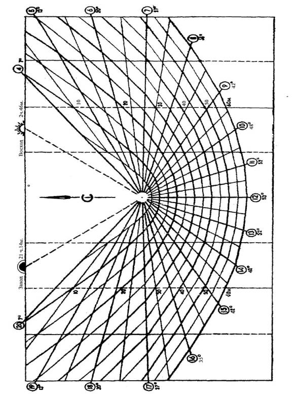 Полученный результат сравнивается с высотой стояния солнца в 12 ч 22 июня (равной 53°).