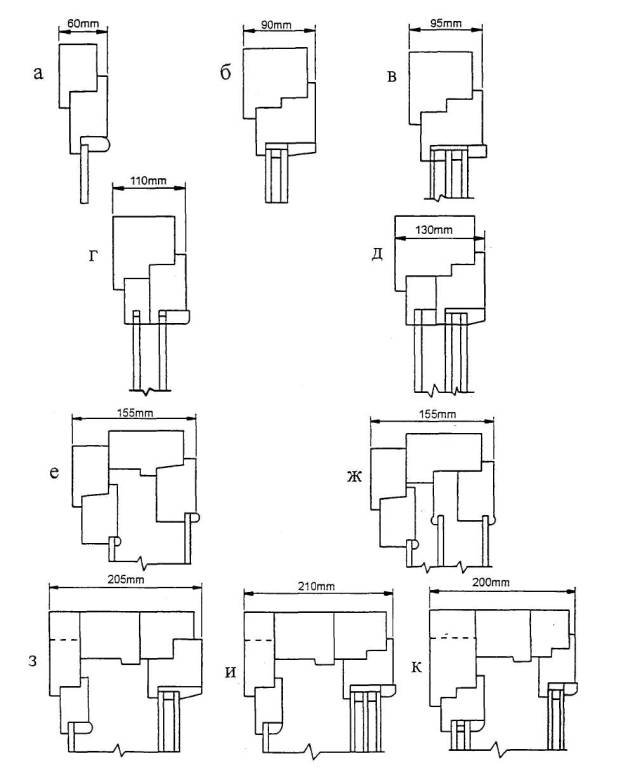 а - одинарный оконный блок с одним стеклом; б - одинарный оконный блок с однокамерным стеклопакетом; в - одинарный оконный блок с двухкамерным стеклопакетом; г - спаренный оконный блок с двойным остеклением; д - спаренный оконный блок со стеклом и стеклопакетом; е - раздельный оконный блок с двойным остеклением; ж - раздельно-спаренный оконный блок с тройным остеклением; з - раздельный оконный блок со стеклом и однокамерным стеклопакетом; и - раздельный оконный блок со стеклом и двухкамерным стеклопакетом; к - раздельный оконный блок с двумя стеклопакетами