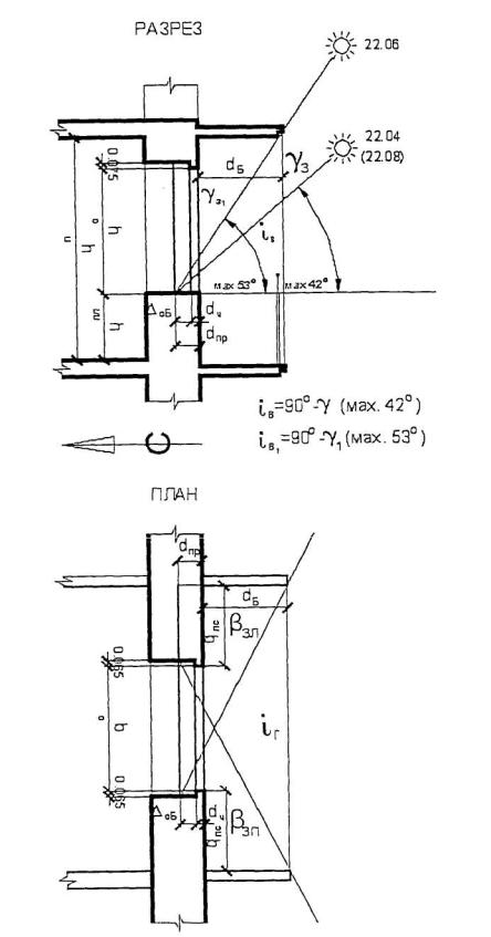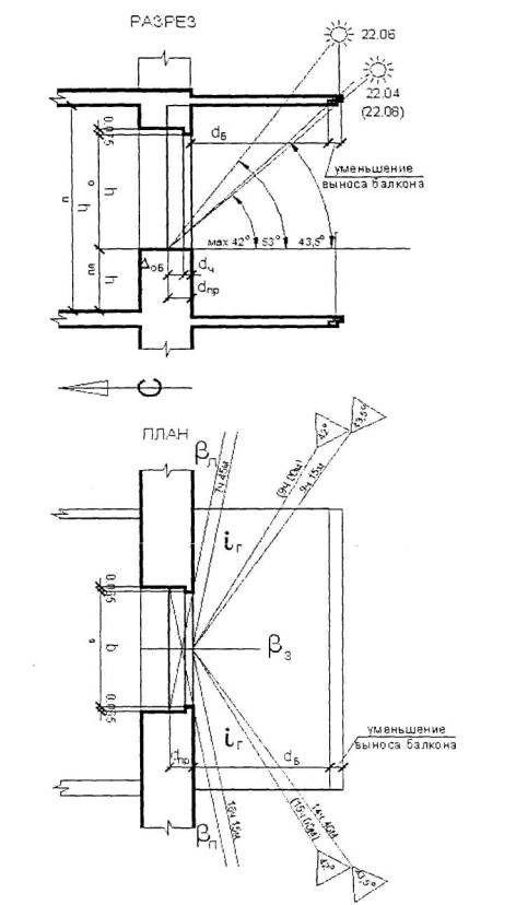 При значительной глубине горизонтальных затеняющих элементов фасада продолжительность инсоляции определяется графическим методом на разрезе и плане светового проема (см. рисунок Б.5). Глубину балкона (лоджии) помещения ориентированного на юг не препятствующего проникновению солнечных лучей предварительно можно определить, умножив расстояние от подоконника до потолка на 0,75 и уменьшив результат на величину глубины проема dпр.