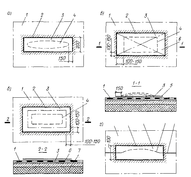 Рис. 1. Устройство заплат на мягких кровлях в местах а - разрывов; б - разрушений ковра; в - вздутий; г - повреждений краев полотнищ; 1 - рулонный ковер; 2 - мастика; 3 - заплата; 4 - граница повреждения; 5 - край полотнища; 6 - стяжка; 7 - утеплитель; 8 - разрезы поврежденного полотнища 3.10. При отсыревании или промерзании отдельных участков бесчердачных крыш, а также мест их сопряжения с наружными стенами следует утеплить эти места, предварительно установив толщину и влажность утеплителя (см. прил. 5). 3.11. До начала производства работ по утеплению переохлажденных домов необходимо загерметизировать стыки сопряжений крыш с наружными стенами и просушить отсыревшие места. Толщину дополнительного слоя утеплителя бесчердачной крыши (или чердачного перекрытия) следует определять расчетом или по таблицам. 3.12. Утепление переохлажденных зон крыш должно быть выполнено по проекту путем напыления утеплителя снаружи, инъецирования в пустоты вспучивающихся теплоизоляционных составов, устройства со стороны помещений утепляющих скосов, дополнительной установки труб отопления в местах сопряжения наружных стен с бесчердачной крышей или другими способами.
