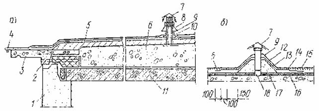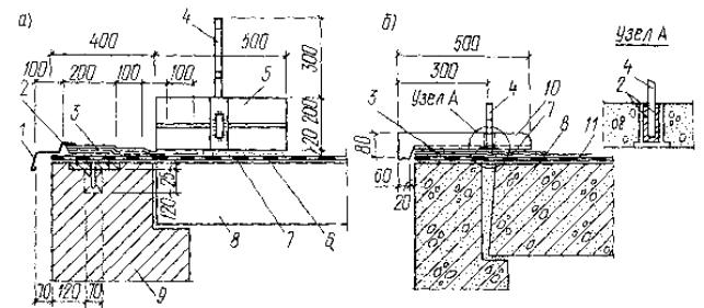 Рис. 9. Устройство ограждений на крыше а - на опорных блоках, устанавливаемых через 1,5-2 мм; б - на парапетных плитах с заложенными в них гильзами 1 - слив из оцинкованной стали; 2 - заливка мастикой; 3 - два дополнительных слоя рубероида; 4 - металлическая стойка ограждения; 5 - опорный блок из двух частей; 6 - раствор; 7 - основной гидроизоляционный ковер; 8 - конструкция крыши; 9 - наружная стена; 10 - бортовая плита; 11 - защитный слой.