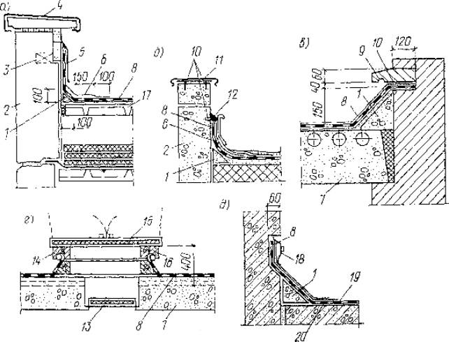а и б - к парапету; в - к стене; г - к борту люка для выхода ну крышу; д - к вентиляционной шахте 1 - переходный блок из асфальта, цементного раствора или легкого бетона; 2 - парапетный блок; 3 - деревянный антисептированный брусок 120×140 мм на гвоздях; 4 - кровельная сталь или слой гидроизоляционной мастики; 5 - фартук из оцинкованной кровельной стали (крепить толевыми гвоздями); 6 - два дополнительных слоя рубероида; 7 - панель крыши; 8 - гидроизоляционный ковер; 9 - железобетонная плита; 10 - дюбеля; 11 - стальная полоса; 12 - слой мастики (изол марок Г-В, УМ-40); 13 - нижняя крышка люка; 14 - борт люка; 15 - верхняя крышка люка; 16 - заделка края ковра шнуром из герметика; 17 - металлический штампованный профиль, пристрелянный дюбелями; 18 - крепление края гидроизоляционного ковра металлической полосой, пристрелянной через 350 мм; 19 - защитный слой; 20 - подстилающий слой. 3.44. Полотнища рулонных материалов следует раскатывать и наклеивать на крышу перпендикулярно направлению стока воды. Перекрестная наклейка слоев ковра не допускается. Количество слоев ковра принимается в зависимости от уклона крыши (см. прил. 2). Покровные рулонные материалы наклеивают как на горячих, так и на холодных мастиках, а беспокровные - только на горячих мастиках. 3.45. Отдельные полотнища рулонных материалов необходимо соединять между собой в продольном и поперечном направлении нахлесткой и сдвигать стыки в смежных слоях относительно друг друга. При уклоне крыши более 2,5 % величина нахлестки полотнищ по их ширине должна составлять в нижних слоях 70 мм, а в верхних - 100 мм.
