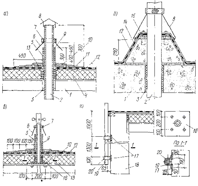 Рис. 4. Установка на крыше элементов инженерного оборудования а - вытяжной стояк канализации; б - вариант примыкания гидроизоляционного ковра к вытяжной трубе; в - трубостойка радиоантенны 1 - конструкция крыши; 2 - вытяжной стояк канализации; 3 - заделка паклей, смоченной в цементном молоке или цементным раствором; 4 - минеральный войлок; 5 - заделка горячим битумом или мастикой «Изол»; 6 - фартук из оцинкованной стали с обжимным кольцом на болтах; 7 - резиновая прокладка; 8 - зонт, из оцинкованной стали; 9 - металлическая гильза; 10 - слой стеклоткани, пропитанной мастикой;. 11 - два дополнительных слоя рубероида; 12 - основной гидроизоляционный ковер; 13 - фланец; 14 - бортики из легкого бетона; 15 - деревянная рамка, закрепленная на пробке; 16 - опорная, плита для стойки радиоантенны; 17 - закладная деталь в стене машинного помещения; 18 - наружная стена машинного помещения лифта или блока выхода на крышу; 19 - трубостойка типа ТТС-1 для крепления мачты телеантенны; 20 – хомут. На плоских кровлях (уклон менее 2,5 %) ширину нахлестки следует принимать не менее 100 мм по длине и ширине полотнищ. Смещение продольных и поперечных стыков смежных слоев должно составлять не менее 250 мм. 3.46. Кромку ковра, уложенную на металлический карнизный слив или настенный желоб, следует защемлять парапетной плитой; противовётровым гребнем, выполненным в виде складки водоотводящих элементов полоской кровельной оцинкованной стали (в виде уголка), приклепанной к карнизному сливу или желобу в процессе заготовки. 3.47. В местах примыкания к стенам, парапету, вентиляционным шахтам, отдельно стоящим металлическим трубам и антеннам, оборудованию край кровельного ковра должен, быть приподнят не менее чем на 200 мм (рис. 3, 4). Кромку ковра следует завести в выдру или штрабу и надежно закрепить. Рулонный ковер в местах примыканий к выступающим конструкциям должен состоять из полотнищ длиной по 2-2,5 м, приклеиваемых с нахлесткой одного слоя на другой не менее чем на 100 мм. При сопряжении с гладкими поверхностями инженерного оборудования кромку приподнятого края ковра после закрепления необходимо покрывать мастикой. На участках ковра, примыкающих к вертикальным поверхностям, следует наклеить два-три дополнительных слоя рулонных материалов. Для уменьшения пересечений гидроизоляционного ковра оборудованием целесообразно теле- и радиоантенны крепить к блокам выхода на крышу или к комплектным вентиляционным блокам. Вертикальный участок ковра сверху должен быть защищен фартуком из оцинкованной стали от затекания воды, повреждений и воздействия солнечных лучей. Нижний слой ковра не рекомендуется приклеивать к наклонному бортику и смежным участкам основания сопрягаемых поверхностей на 300-400 мм. 3.48. При расположении полотнищ рулонного материала вдоль ската конек крыши следует перекрыть поочередным заведением полотнищ на соседний скат не менее чем на 200 мм, а верхнего слоя - на 250 мм (первый слой рулонного материала заводится на соседний скат насухо для погашения, температурных деформаций панелей). При расположении рулонных материалов параллельно коньку полотнища смежных скатов необходимо поочередно стыковать непосредственно у конька и на расстоянии 300-400 мм от него то на одном, то на другом скатах, пропуская их через конек и соединяя нахлесткой 100-150 мм. Сверху конек должен быть покрыт дополнит