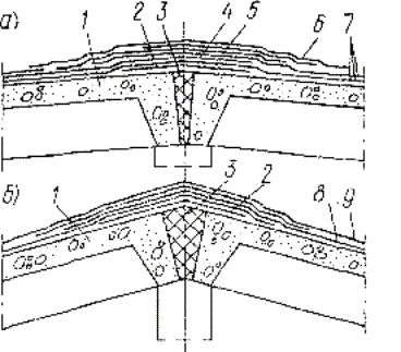 Рис. 5. Покрытие конька, крыши а - при уклоне менее 15 %; б - при уклоне более 15 % 1 - несущая конструкция; 2 - полоса из стеклоткани, пропитанной мастикой шириной. 350 мм; 3 - набивка теплоизоляционным материалом; 4 - первым дополнительный слой; 5 - второй дополнительный слой; 6 - наружный дополнительным слой; 7 - полотнища трехслойного рулонного ковра, примыкающие к коньку; 8 - внутреннее полотнище двухслойного покрытия; 9 - наружное полотнище того же покрытия