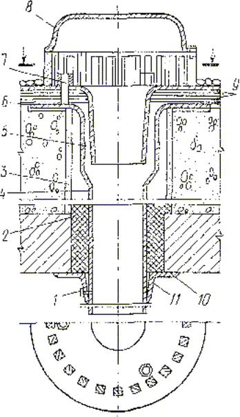Рис. 6. Примыкание гидроизоляционного ковра к типовой сливной воронке внутреннего водостока 1 - прижимной винт; 2 - утеплитель; 3 - асбестоцементная труба; 4 - чаша воронки; 5 - прижимное кольцо; 6 - дополнительный слон из стеклоткани, пропитанной мастикой; 7 - крепежный винт; 8 - крышка; 9 - гидроизоляционный ковер; 10 - эластичная прокладка; 11 - фланец