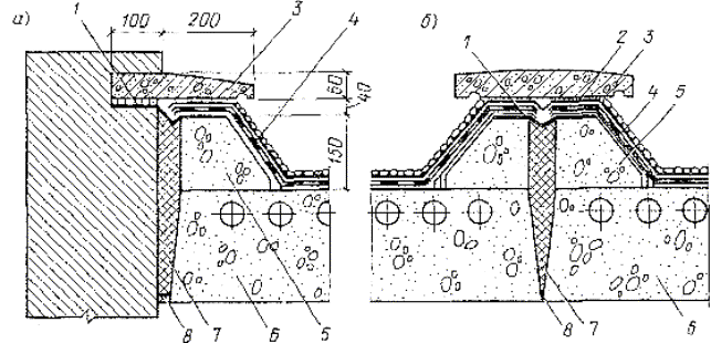 Рис. 7. Примыкание рулонного ковра к деформационным шрам а - температурно-осадочный шов, расположенный у стены; б - температурно-осадочный шов, расположенный между панелями 1 - слой мастики «Изол»; 2 - металлический компенсатор; 3 - железобетонная плита; 4 - гидроизоляционный ковер; 5 - бортики из легкого бетона; 6 - панель крыши; 7 - теплоизоляционный слой; 8 - паронепроницаемый полимерный слой слоя шириной 1,5-2 м, потом основной ковер, а сверху уложить вторично два дополнительных слоя рулонного материала с нахлесткой с основным гидроизоляционным ковром на 100-150 мм. 3.51. В местах расположения температурно-осадочного шва край гидроизоляционного ковра необходимо приподнять на наклонный бортик и защемить бетонной плитой. Предварительно шов должен быть перекрыт компенсатором из листовой стали (рис. 7). 3.52. Горячие битумные мастики следует нагревать до 180°С, а дегтевые до 160 °С. Температура битумных мастик при нанесении не должна быть ниже 160°С, а дегтевых 130°С. Температура нагрева битумно-резиновых мастик должна быть 180-210°С, при нанесении 160-180°С, а при нагреве и во время нанесения гудрокамовых мастик не ниже 130°С. 3.53. При наклейке рулонных материалов горячую мастику следует наносить на основание ровным слоем без пропусков, узкими полосами перпендикулярно направлению раскатки рулона и разравнивать гребком или кровельной щеткой на всю ширину полотнища. В процессе наклейки рулонный материал должен быть плотно прижат к основанию для выдавливания лишней мастики (перед раскатываемым рулоном должен образоваться валик мастики высотой 8-10 мм), и прикатан цилиндрическим катком массой до 80 кг. Полотнища в стыках необходимо тщательно прогладить. 3.54. При применении холодных мастик для наклейки рулонных материалов на основание из цементно-песчаного раствора, ее наносят равномерным слоем не более 1 мм. Полотнища следует прикатать катком и наклеивать каждый последующий слой рулонного ковра не ранее чем через 12 ч. При температуре наружного воздуха ниже 5°С мастику необходимо подогревать до 70°С. 3.55. Ремонт кровель с применением наплавляемых рубероидов огневым способом может выполняться при температуре наружного воздуха не ниже минус 20°С. Температура разогрева мастичного слоя рубероида должна быть в пределах 140-160°С, но не выше 180°С. 3.56. Для наклейки рулонных материалов методом оплавления мастичного слоя (огневой способ) следует, использовать только специальный рубероид (ТУ 21-27-35-76). Наклеивать на кровлю обычный рубероид методом оплавления не допускается. 3.57. Перед началом ремонтных работ должны быть закончены подготовка механизмов, оборудования, приспособлений, инструментов (см. прил. 4), проверены правильность выполнения основания под кровлю, установка водосточных воронок, вентиляционных шахт, устройство стенок деформационных швов и др. 3.58. Наплавляемые рубероиды, применяемые для нижних слоев кровельного ковра, следует очищать от минеральной посыпки, а рубероиды для верхнего слоя ковра - также от крупнозернистой посыпки на ширину нахлестки полотнищ. 3.59. Ремонт кровельного ковра начинают с пониженных участков кровли (с карнизных свесов и ендов), при этом подачу материалов производят навстречу потоку кровельных работ. 3.60. При температуре ниже 0°С наплавляемый рубероид перед наклейкой необходимо выдержать в тепляках в течение 24 ч. при температуре выше 