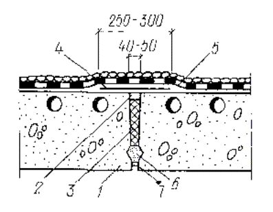 Рис. 8. Наклеивание рулонного ковра в местах стыка панелей 1 - панель покрытия; 2 - заделка раствором или герметиком; 3 - теплоизоляция; 4 - полоса рулонного материала, приклеенная к одной из панелей; 5 - гидроизоляционный ковер; 6 - цементный раствор; 7 - паронепроницаемый полимерный слой для устройства гравийного и защитных слоев: гравий чистый сухой с размером зерен 5-10 мм или каменная крошка из пород с морозостойкостью не ниже Мрз-100; битумно-алюминиевая краска марки БТ-177; битумно-полимерный состав на основе водорастворимой полиамидной смолы. 3.88. Перед нанесением мастичного слоя из битумных и битумно-полимерных эмульсий основание должно быть огрунтованно этой эмульсией (расход до 1 кг/м2). Швы между сборными железобетонными панелями следует покрывать полосками из рулонных материалов (стеклоткань, рубероид) шириной 250 мм, наклеиваемыми с одной стороны шва (рис. 8). Устройство основного гидроизоляционного ковра на битумных или битумно-резиновых мастиках выполняется с соблюдением следующих требований стеклохолст расстилают на основание кровли с нахлесткой полотнищ по ширине и длине 100 мм; горячую мастику наносят сплошным слоем до полной пропитки стеклохолста и склеивания его с основанием; последующие слои кровли выполняют аналогичным способом. На кровлях с уклоном менее 10 % основание под кровлю покрывают сначала горячей мастикой и после ее остывания устраивают гидроизоляционные слои, 3.89. Битумно-латексные эмульсии следует наносить с коагулятором (5 %-ный раствор хлористого кальция) в четыре слоя. Сначала на основание необходимо нанести эмульсию, затем после ее высыхания расстелить стеклосетку и покрыть ее эмульсией. Кромки полотнищ стеклосетки должны быть тщательно приклеены. 3.90. Места примыкания мастичных кровель к вертикальным поверхностям, выступающим над крышей конструкций и оборудования, сопряжения с воронками внутренних водостоков, ендовы и конек устраивает также как для рулонных кровель с нанесением дополнительных мастичных слоев, армированных стекломатериалами. 3.91. Защитные покрытия на поверхностях крыш из железобетонных и асбестоцементных панелей лоткового сечения восстанавливают после укрепления нательников и герметизации стыков. 3.92. Для устройства защитного покрытия следует применять: краску БТ-177 и битумно-полимерный состав. Окрасочный материал наносят равномерно, без пропусков, по всей изолируемой поверхности не менее чем в два слоя толщиной 0,5-2 мм. Последующий слой наносят лишь после отвердения и просушки предыдущего. Защитные составы на основе синтетических смол необходимо устраивать в соответствии с требованиями СНиП III-23-76 «Защита строительных конструкций от коррозии». 3.93. Восстановление и устройство защитных слоев следует выполнять после ремонта и окончания работ по замене гидроизоляционного ковра, а также составления акта о его приемке. До нанесения защитного слоя поверхность кровельного покрытия очищают от пыли, слабодержащейся слюдяной или песчаной посыпки и существующего защитного слоя, который увлажняют, осторожно, очищают скребками и удаляют без повреждения верхнего покрытия кровли. Поверхность кровли перед устройством защитного слоя должна быть сухой и ровной. Защитные слои кровель, из рулонных и мастичных материалов восстанавливают по мере необходимости, но не реже чем через 3 год