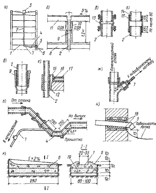 Рис. 14. Схема внутреннего водоотвода с наружным выпуском а - общая схема водоотвода жилого дома; б - утепление стояка в чердачном помещении (по расчету); в, г и д - компенсационные устройства; е - деталь пересечения перекрытия водосточными стояками; ж - деталь присоединения гидравлического затвора бытовой канализации; з - гидравлический затвор на открытом выпуске; и - деталь пересечения открытого выпуска с наружной стеной; к - открытый лоток 1 - перекрытие над техническим подпольем; 2 - стояк внутреннего водостока; 3 - воронка внутреннего водостока; 4 - гидравлический водяной затвор; 5 - наружный выпуск; 6 - открытый лоток; 7 - водослив в канализацию; 8 - чердачное перекрытие; 9 - температурный компенсатор стояка; 10 - утепление стояка в пределах чердака; 11 - кровельная плита; 12 - гильза из асбестового картона; 13 - муфта; 14 - сальниковая набивка; 15 - заделка цементным раствором; 16 - плинтус; 17 - упругая прокладка; 18 - утепление наружной стены; 19 - гравийная или щебеночная подготовка по песчаной подушке и уплотненному грунту (размеры на рис. «и», «к» приведены в сантиметрах) 3.160. Для устранения обледенения системы внутреннего водоотвода с наружным выпуском необходимо утеплять стояк в пределах чердачного помещения и своевременно обеспечивать сброс талой воды в бытовую канализацию. При отсутствии слива талых вод в канализацию необходимо установить водослив из труб диаметром 25 мм, присоединенных к системе внутреннего водоотвода (рис. 14). 3.161. Отводные трубы от стояков с открытым выпуском необходимо оборудовать гидравлическим затвором высотой 100 мм в помещениях с температурой в зимнее время не менее 5°С. Утепление стояка следует выполнять из слоя толщиной 5-10 см эффективного теплоизоляционного материала (минераловатных плит, асбестозурита и др.) с верхним пароизоляционным слоем из гидроизоляционного рулонного материала. Теплоизоляция не должна затруднять смену набивки в температурном компенсаторе стояка внутреннего водоотвода. 3.162. При намокании теплоизоляции стояка внутреннего водостока необходимо по верху ее уложить слой пароизоляции, предварительно просушив утеплитель. Если конденсат выпадает на поверхности теплоизоляционного слоя, то следует уложить дополнительные слои теплоизоляции и пароизоляции. 3.163. Щель в перекрытии вокруг стояка следует заделать упругим материалом и сверху зашпаклевать. Целесообразно в месте пересечения трубопровода с конструкцией установить гильзу из упругого листового материала. 3.164. Лоток для отвода воды от наружного выпуска, пришедший в негодность, должен быть заменен новым бетонным длиной не менее 2,5 м, шириной 300-500 мм с уклоном более.4%. Во всех водоприемных воронках необходимо установить колпаки с глухим верхом. 3.165. Необходимость в ремонте наружных водостоков, выполненных из кровельной листовой стали, возникает при ослаблении крепления их элементов (карнизных свесов, желобов, водоприемных воронок и др.), проникании влаги через фальцы, разъединении звеньев и разрушении водосточных труб, механических повреждениях свесов и желобов, коррозии металла, старении окрасочного слоя. 3.166. При ремонте водостоков следует устранить податливость элементов водосточных труб исправлением существующих и постановкой дополнительных креплений, а также уплотнением фальцев, которые предварительно промазывают суриком. Для ус