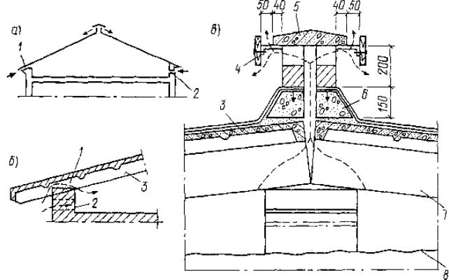 Рис. 16. Устройство специальной системы естественной вентиляции чердачного помещения крыши с железобетонными несущими конструкциями а - схема системы вентиляции чердачного помещения; б - щелевой продух под карнизом и подкарнизные точечные отверстия (вариант показан пунктиром); в - коньковая щель из элементов коробчатого типа 1 - подкарнизный щелевой продух; 2 - подкарнизный точечный продух; 3 - железобетонная панель; 4 - отражательные доски толщиной 19 мм (крепятся к кронштейнам из полосовой cтали на болтах); 5 - коробчатые железобетонные элементы; 6 - бортик из лёгкого бетона; 7 - железобетонная стропильная нога; 8 - утеплитель чердачного перекрытия
