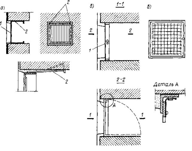 Рис. 17. Установка защитных решеток в подкарнизных точечных отверстиях а - съемная швеллерообразного типа; б - открывающаяся плоская; в - решетка 1 - решетка; 2 - рамка из полосовой стали вызывающих таяние снега на кровле в морозные дни, что приводит к обледенению наружных водоотводящих устройств здания. 4.12. Площадь вентиляционных отверстий необходимо определять расчетом, выполняемый проектной организацией. Щелевые продухи в коньковой части крыши с деревянными несущими и железобетонными элементами могут быть выполнены, как это показано на рис. 16. Для этого в коньке крыш сдвигают вниз по скату крайние края обрешетки. Над щелью устраивают дощатый оголовок, препятствующий попаданию в чердачное помещение атмосферных осадков. Поверхность оголовка покрывают кровельной сталью. В карнизной части стеньг вентиляционную щель устраивают следующим образом: нижние доски решетки, служащие основанием под свесы и желоба кровли, отрывают; на кобылки прибивают рейки клиновидной формы длиной 1-1,5 м и толщиной, равной высоте продуха. Затем восстанавливают обрешетку. Точечные карнизные продухи пробивают в кладке стены на 50-100 мм выше утепляющего слоя чердачного перекрытия. С наружной стороны, вентиляционных отверстий устанавливают решетки с ячейками: не более 20×20 мм или жалюзи. Решетки (жалюзи) следует делать створными или съемными, что позволяет без нарушения их крепления устанавливать консоли для подвесных лесов и люлек при ремонте фасадов (рис. 17). Нижние щелевые продухи могут быть сделаны также путем разборки кирпичной кладки под обрешеткой, если позволяет конструкция стены. 4.13. Одновременно с устройством специальной системы вентиляции в крышах необходимо провести теплоизоляцию чердачных перекрытий (с устройством известково-песчаной корки по засыпке) и горячих трубопроводов, заделать неплотности в вентиляционных коробах и шахтах (включая дверки), герметизировать входные двери (люки) в чердачное помещение, а также устранить все Другие неисправности, способствующие избыточным тепло-, влагопоступлениям на чердак. Необходимо также изолировать вентили горячих трубопроводов, расширительных, бачков и воздухосборников, установив на них съемные утепленные короба. 4.1.4. Дополнительными мерами по устранению обледенения поверхности крыш и ее водоотводящих устройств является уменьшение воздействия солнечной радиации, на кровлю, а также придание ее поверхности гидрофобных свойств, позволяющих снизить сцепление воды, льда и пыли с материалом кровли. Для этого рекомендуется применять покрасочные материалы светлых тонов, обладающие повышенными водоотталкивающими свойствами (табл. 2). 4.15. Для зданий с большим поступлением в чердачные помещения тепла, удаление которого вентиляционными средствами не представляется возможным, рекомендуется устройство внутренних водостоков